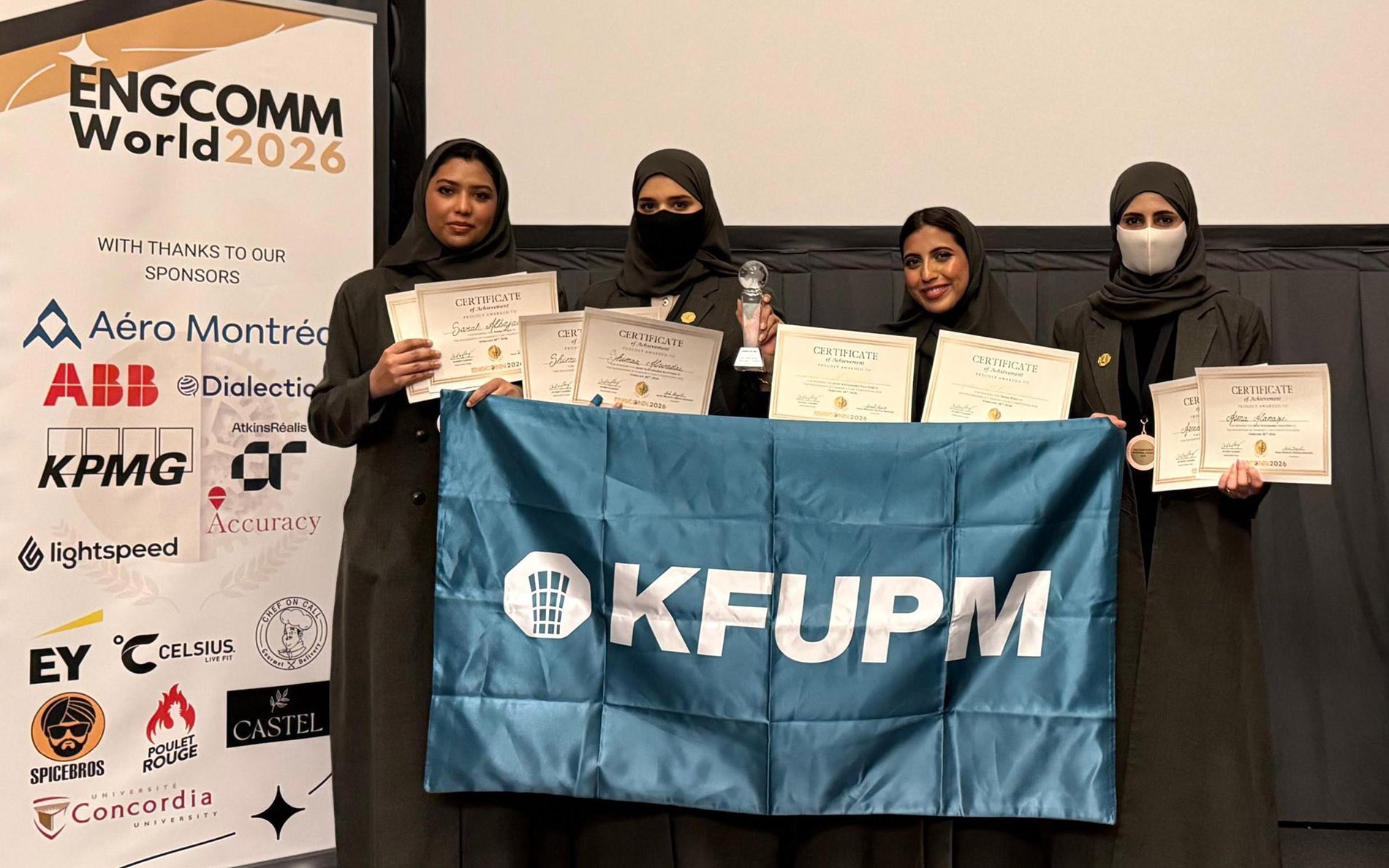 KFUPM students delivered an outstanding international performance at the prestigious ENGCOMM 2026 competition in Montreal, Canada, held on February 24th, 2026, securing first place in their group, third place overall in the competition, and earning the Best Sustainable Solution Award.