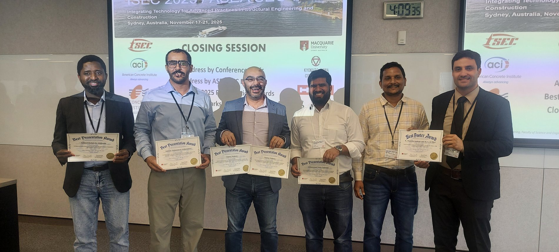 At the Joint International Structural Engineering and Construction Society (ISEC-13 / ASEA-SEC-7) Conference, held 17-21 November 2025 at City Campus, Sydney, New South Wales, Australia, KFUPM made a strong impression. This year’s theme, “Integrating Technology for Advanced Practices in Structural Engineering and Construction,” focused on the latest best practices in the field. The event brought together academics, students, industry practitioners, and emerging researchers from around the world to exchange ideas and present work aligned with this theme.