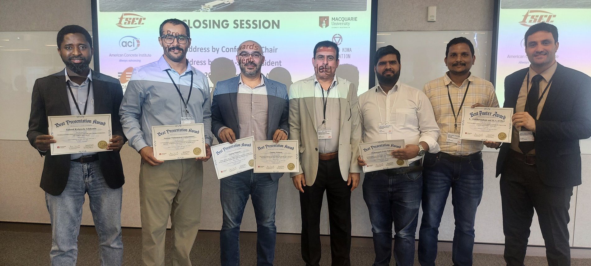 According to Dr. Mohammed Al-Osta, Center Director for Construction & Building Materials (IRC-CBM), several faculty members and students presented KFUPM’s projects. In his own words, “participants delivered an outstanding performance at the (ISEC-13 / ASEA-SEC-7) Conference, where their research quality and presentation skills received high praise from the conference chair and attendees.” The projects they showcased in Sydney reflected one to two years of sustained research work.