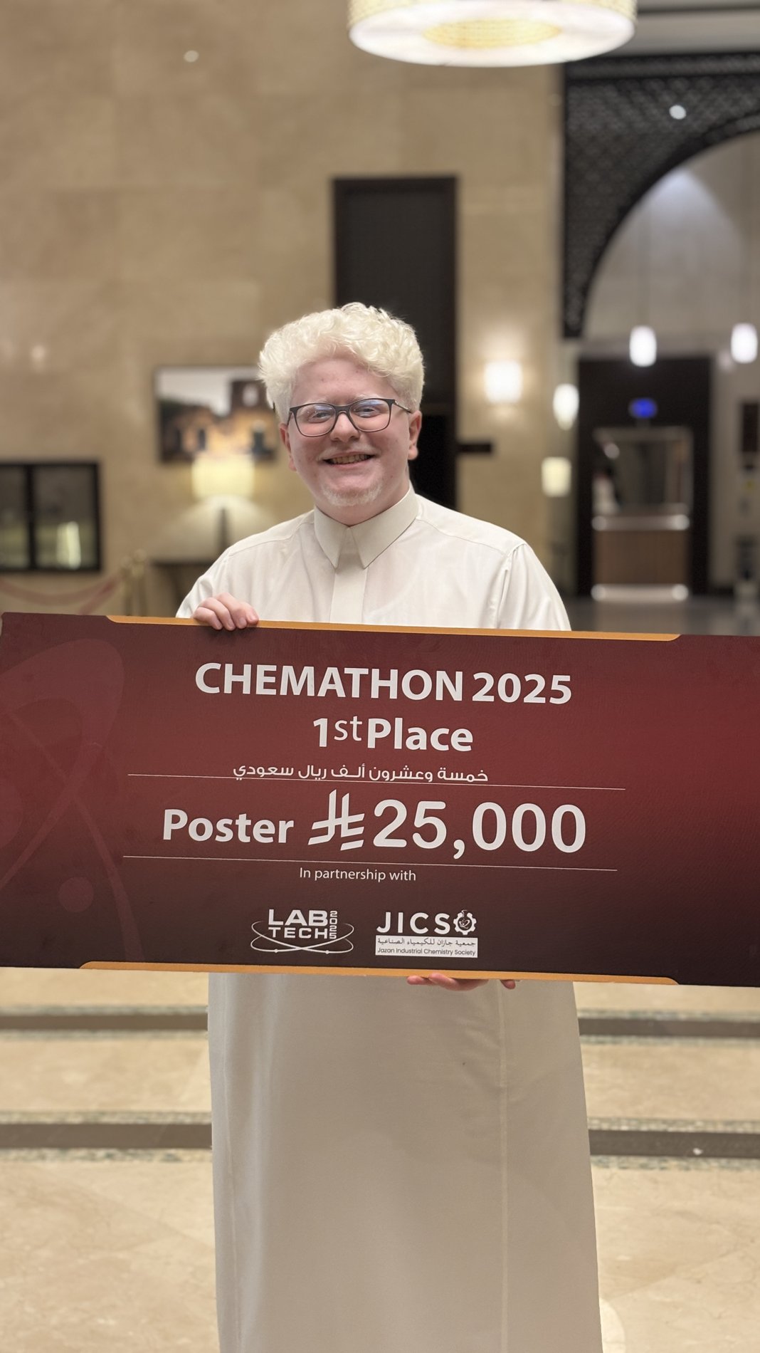 Salman Al-Shehri, a standout student in the Bioengineering program under the College of Chemistry at KFUPM, achieved exceptional recognition on both the national and international stage. He earned 1st Prize in the Chemathon competition at the LabTech 2025 International Conference in Jazan, held under the patronage of HRH Prince Mohammed bin Abdulaziz bin Mohammed. Earlier, he also secured 2nd place in the SCACSI Chemathon hosted at KFUPM and delivered an outstanding research presentation to the university’s Industrial Advisory Board.
